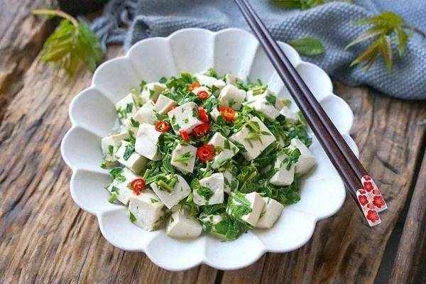 功效:豆腐生食,味甘、性凉,能清胃热、生津液、消痰下气;香椿味苦、性平,具有清热化湿、解毒作用,二者搭配,可清肺胃热、生津液、利湿热,对老年人胃火上壅、口干燥渴以及痰热咳嗽者有一定益处。