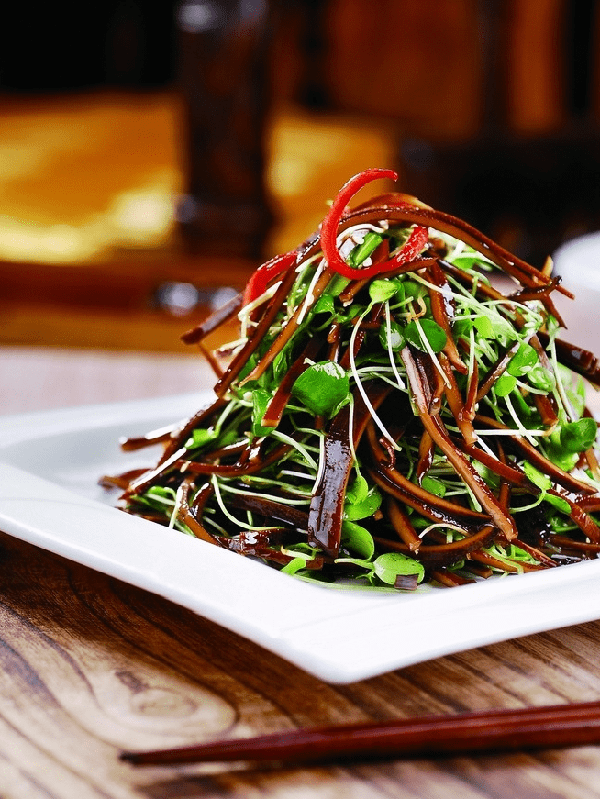 卤煮配料有花椒、肉蔻、大料等,使用火候及时间掌握适当,色、味入丝而不软、不断,故其色正味香,丝条整齐,气质咸香,最宜佐酒下饭,是素食中富有营养、清香可口的上品。