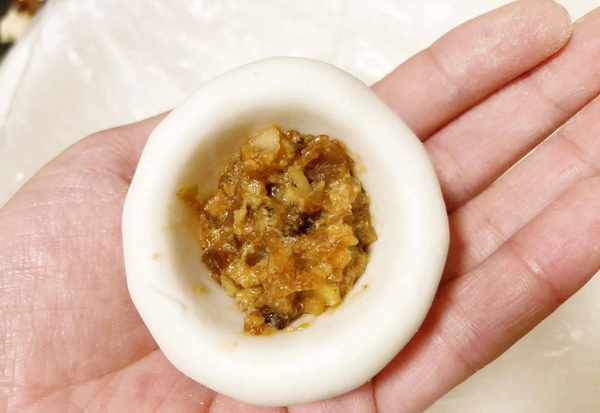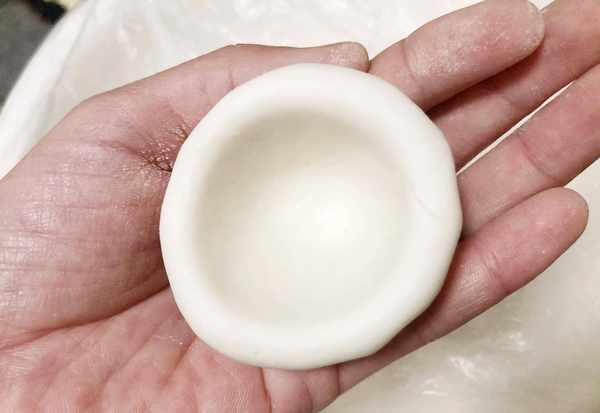 (7)取一个面揉圆,将它捏成小碗的形状,放入馅料用虎口处慢慢收紧再揉光滑