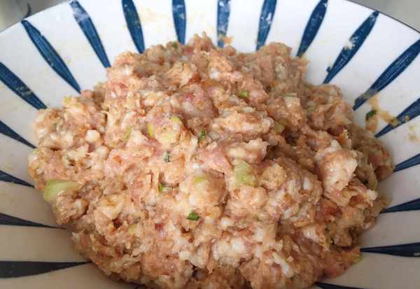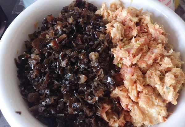 馅料:猪五花肉1斤、木耳6朵、大葱2根、鸡蛋1个、骨汤半碗、香油、胡椒粉、盐、料酒、蚝油、鸡粉、十三香