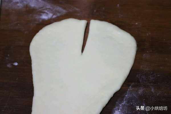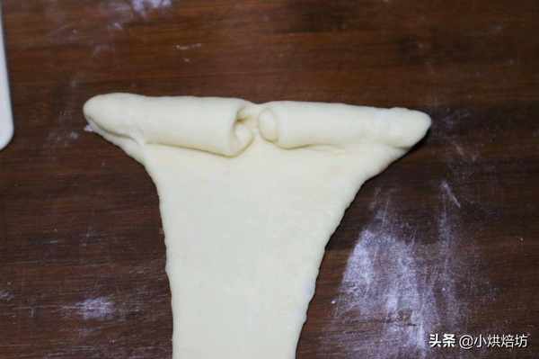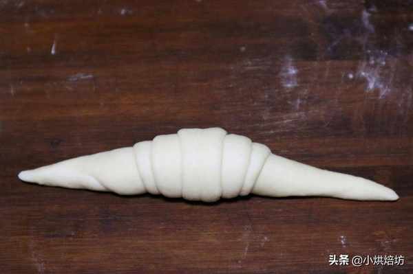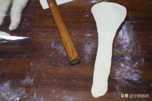 :取一个醒发好的面团擀开成长锥形,擀薄一些。面团醒发一定要充分,才能很好的把面团擀开,如果擀不开的话,就继续醒发。