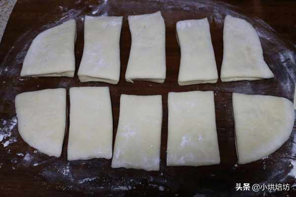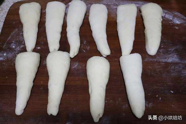 :把分割好的面团整理成锥形,顺势搓长一些,盖上保鲜膜醒发30分钟。在分割面团的时候可以直接切成三角形,这样整理成锥形就比较简单。