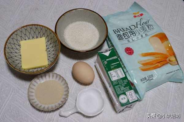 金龙鱼面包用高筋小麦粉 500克,酵母5克,糖90克,干酵母5克,鸡蛋液100克,纯牛奶230克,食用盐5克,无盐黄油40克