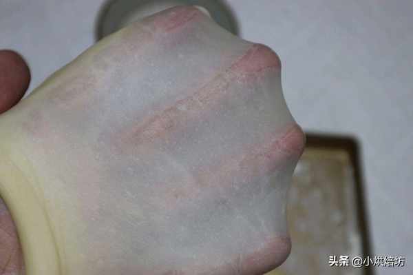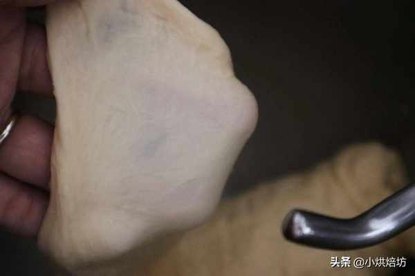 :再中速打面,到面团扩展阶段,能扯出膜,这时膜还没有很薄。