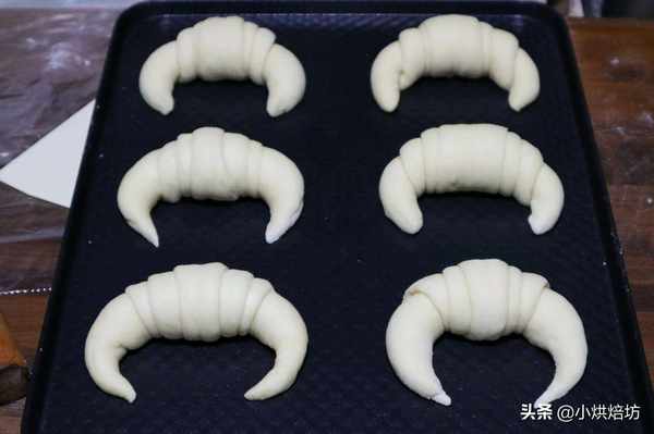 :整形好的面团摆放在烤盘里。进行最后一次发酵。温度35度湿度78%左右,发酵到原来的两倍大。1小时左右。
