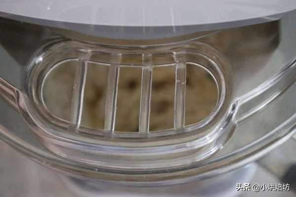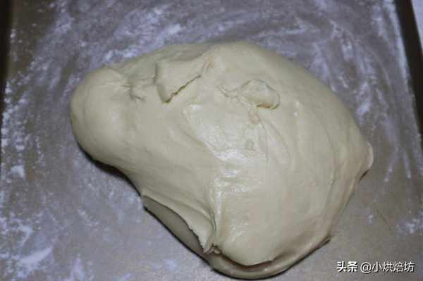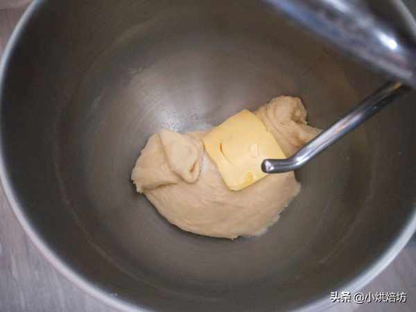 :黄油被完全吸收后,转高速搅打三分钟,注意多停下来看看面团状态,当面团光滑有光泽,不粘手柔软有弹性,能扯出成片薄膜,面团打好。打好的面团温度不要超过27度。