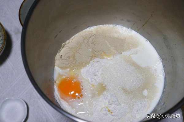 :把材料除了盐和黄油外的其他东西投入到面缸里。