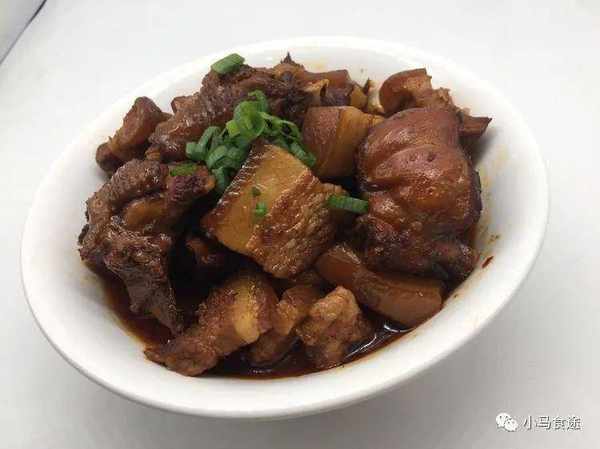 2. 炒锅再旺火上烧热,放入熟猪油,油烧热时,把葱下锅略煸,放入料酒、酱油、糖、八角、再放入猪腿肉,烧沸后改小火焖约30分钟后,再用旺火将卤汁收浓,去掉八角,淋上香油。