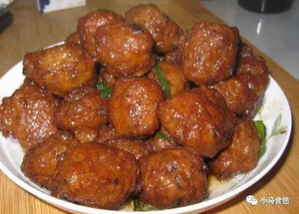 2. 锅置旺火上,放熟菜油烧至七成油温时,用手将肉馅挤成直接约1.7厘米大的肉丸,放入锅内炸至皮酥并呈浅黄色时捞出。