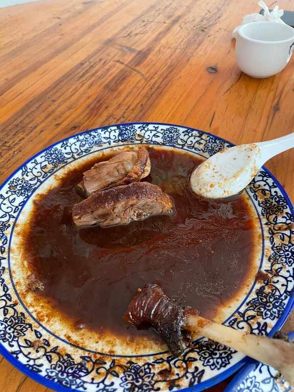 同行的朋友连汤汁都要干完了,这时我发现我完全忽略了毫无装修的装修,简陋的门头,昏暗的灯光,以及四周打满拆迁的房屋。