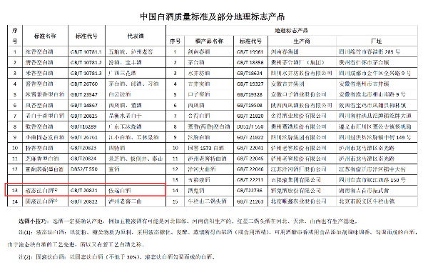 下面附上常见的中国白酒质量标准及部分地理标准产品标准代号和酒的分类。