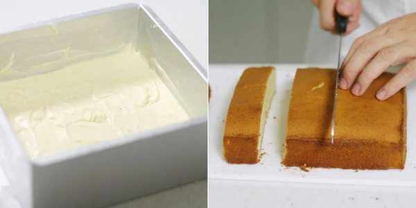 边长为7寸(约18cm)的方形蛋糕模内壁涂上薄薄的一层黄油防粘。把搅打好的面糊倒入模具,抹平。放入预热好180℃的烤箱中层,烤30分钟左右,至表面金黄色,用牙签扎入并拔出后牙签上没有残留物,就表示熟了。