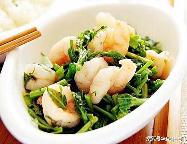 4、锅中倒油烧热,下虾仁至8分熟,倒入香椿杆,加盐炒软,再倒入香椿叶略炒即可出锅。