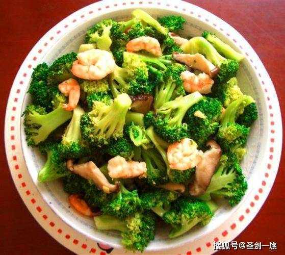 5、虾仁煸炒变色后,下入西兰花,加生抽提味,炒匀出味装盘。