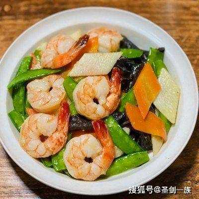 食材:鲜虾,黄瓜,胡萝卜,黑木耳,蒜末。