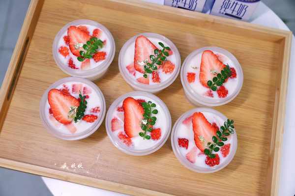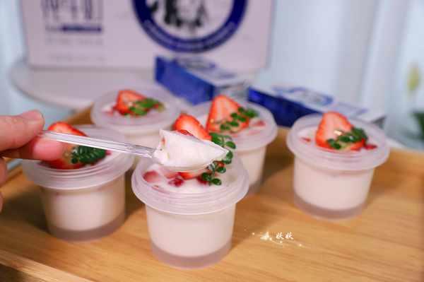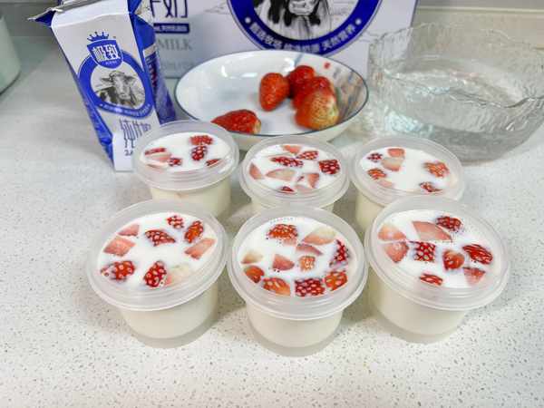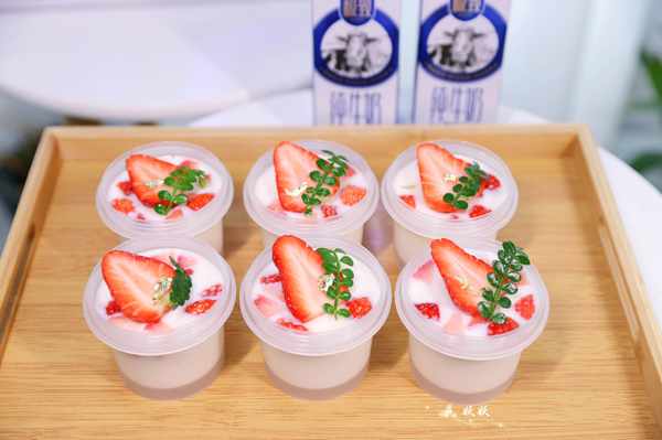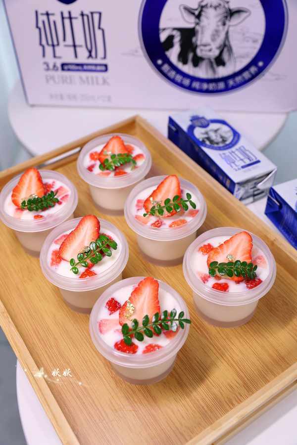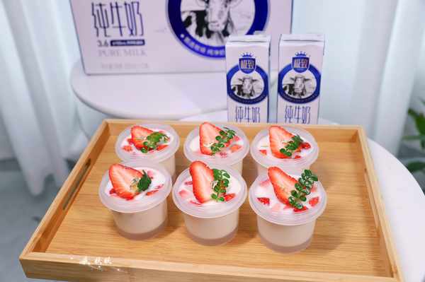 9,把容器送入冰箱冷藏室,等待两个小时凝固后就可以食用了,表面可以用草莓来做装饰,这样做出来的布丁不但好看,吃起来也QQ弹弹,丝滑软嫩。