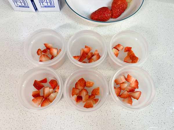 3,切一些草莓粒在底部,这个季节的草莓最好吃,不喜欢吃草莓的朋友可以换成芒果,猕猴桃等,或者什么都不加,只做成纯牛奶布丁。