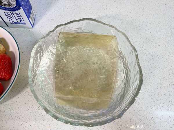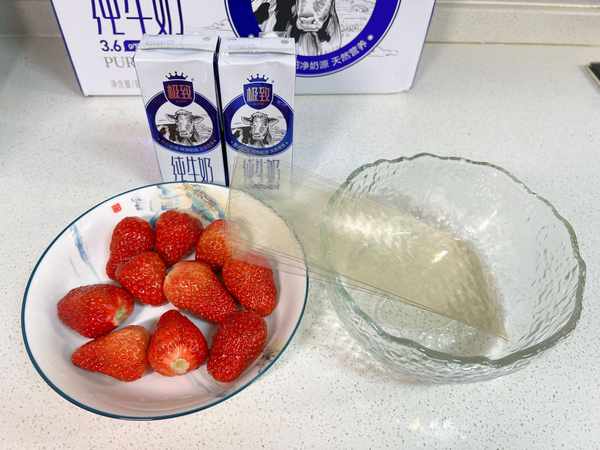 用料:纯牛奶500毫升,吉利丁片20克,白砂糖一勺,草莓适量。