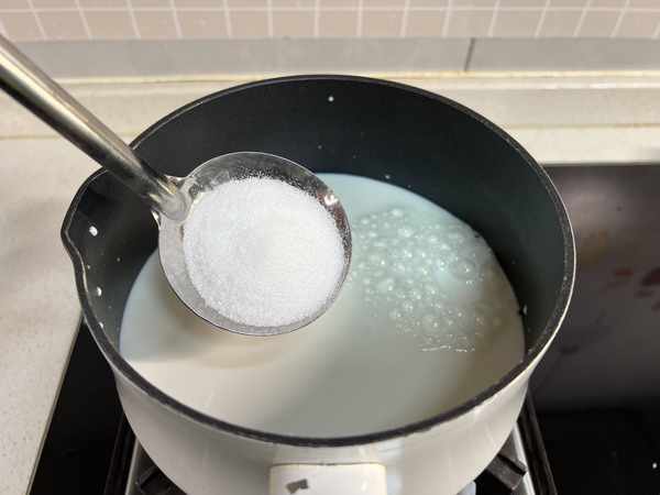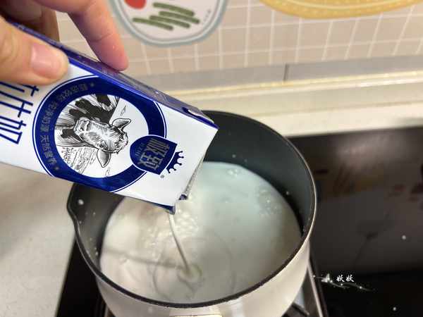 4,锅中加入纯牛奶,热牛奶的锅要用不粘锅,玻璃锅或者不锈钢材质的。