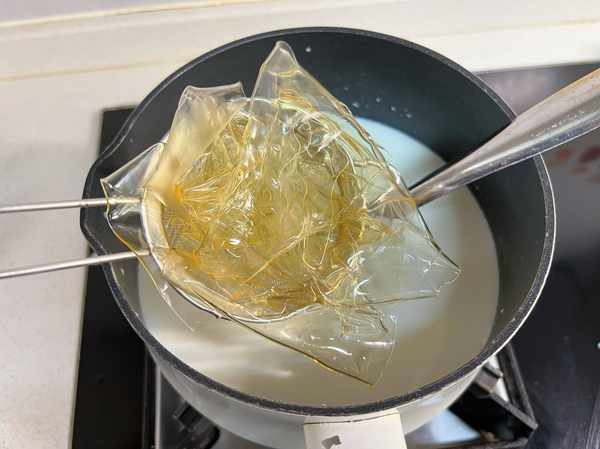 2,吉利丁片用冷水泡软,吉利丁片是一种从鱼骨中提炼出来的胶质,常用在甜品中起粘合作用,是一种健康的食材,但是泡的时候一定要用凉水,用热水会融化。