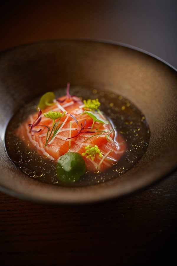 以日本酒曲腌制浸润三文鱼,肉质更添细腻柔软,与经过烟熏的三文鱼清汤相得益彰。清爽的腌制茴香与黄瓜配菜不仅在视觉上添色,再一次平衡了三文鱼的口感。
