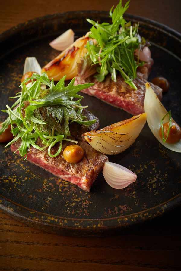 Grilled M8 Wagyu Sirloin, Grilled Onion, Picked Shallot, Onion Red Miso Puree,Mizuna Salad