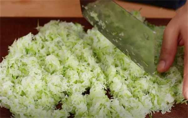 5.萝卜丝挤干水分之后再用刀剁碎一些。