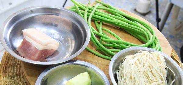 取一个小盆,把汤汁盛出来一部分,锅内留少许汤汁,豆角控去水分,放入锅内,然后把面条铺在豆角上面,