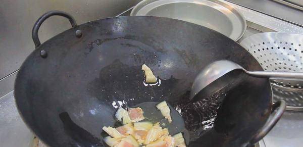 现在我们开始烹饪,锅内烧油,油热以后,放入五花肉片煸炒,把五花肉炒至发亮,煸炒出五花肉片中的油,