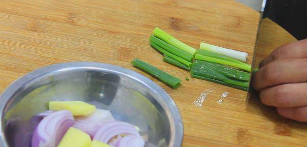 接下来准备一些小料,用来出味,大蒜几粒,切成蒜片,洋葱一半,切成洋葱片,生姜一小块 ,切成姜片。小葱几根,切成葱段,一起放在盆内。