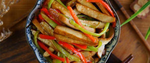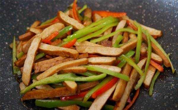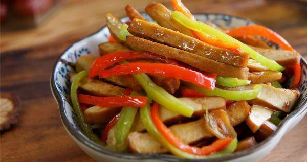 所需食材:4块豆干,青椒1个,红椒1个,大蒜3瓣,小葱2段,3勺生抽,1勺蚝油,1勺胡椒粉,适量鸡精和盐。