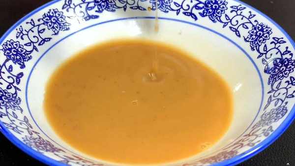 3.调料汁:碗中加入一勺生抽、少许食盐和白糖、一点蚝油和玉米淀粉,最后倒入一小碗钱给水,用勺子搅拌均匀备用。
