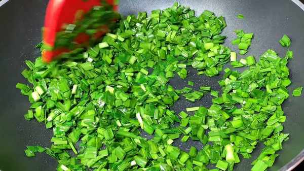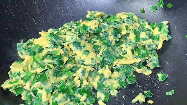3.锅内倒入少许食用油,油热后倒入韭菜,小火慢炒,韭菜炒至七分熟,倒入鸡蛋液,开小火慢慢的翻炒,鸡蛋凝固后,韭菜翻炒三分钟就可以出锅了。