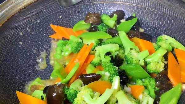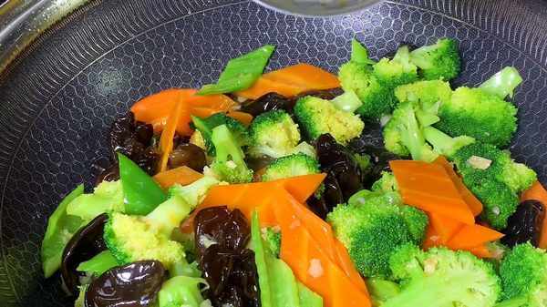 3.锅内倒入适量的油,油热后下入大蒜、炒出香味后,加入一勺耗油,再次快速翻炒,炒均后加入少许清水,再下入西兰花和胡萝卜,继续快速的翻炒。