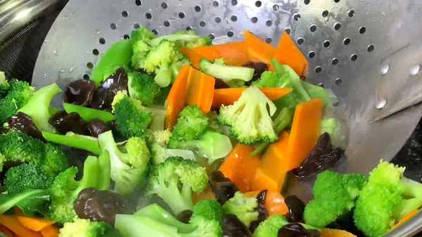 2.大蒜拍碎切蒜末、木耳提前泡发好,锅内倒入适量的水,水开后加入一勺食盐、几滴食用油,下入胡萝卜、西兰花、木耳、青椒,水开后焯水1分钟后,捞出放入凉水中。