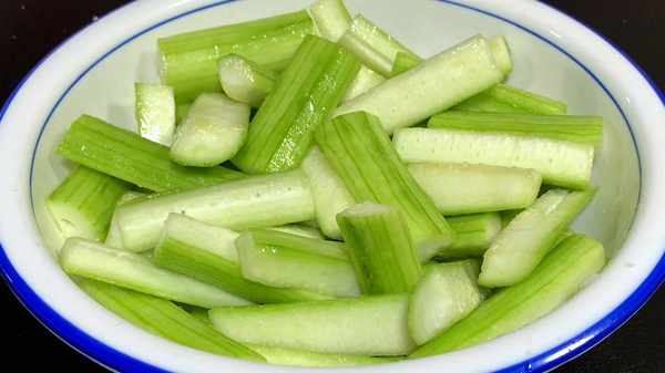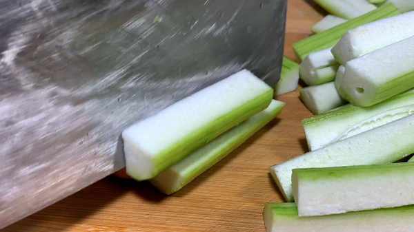 1.先将丝瓜刮掉外皮,去掉头部和尾部,切成长段,再一分四,切好后装入碗中,加入一勺盐,用手抓拌均匀,使丝瓜裹满着食盐,腌制20分钟左右。