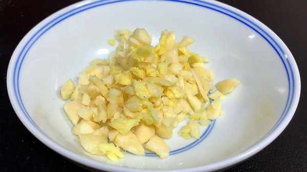 2.大蒜拍碎切蒜末、生姜也拍碎切末、小米椒切小圈、小葱切葱花、切好后装入碗中备用。