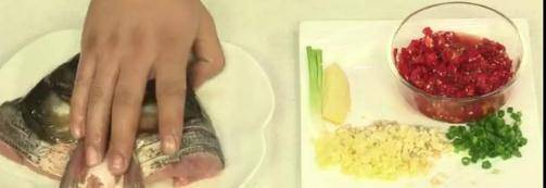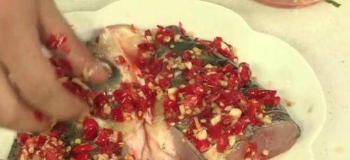 3、剁椒加入盐、味精、姜末、蒜末拌匀,平整铺在两面鱼头上。