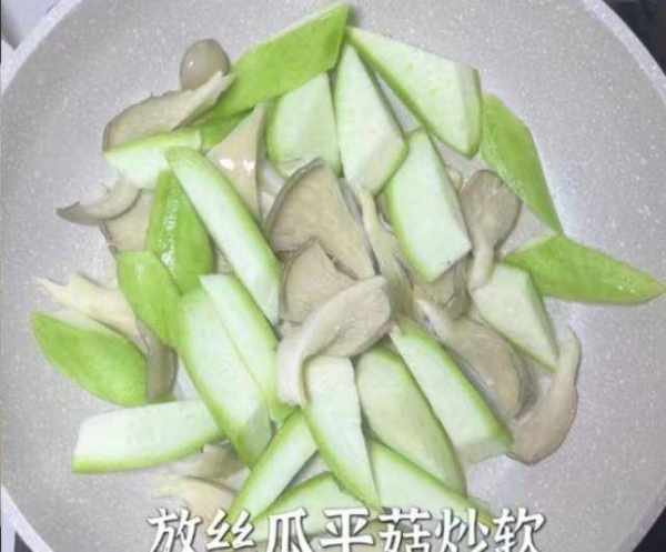 5:锅底烧热加上冷油,等待油温烧热,加上蒜粒炒香,放入一些丝瓜和平菇炒至变软,将水分都炒出来。