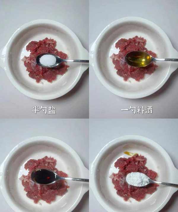 4:碗中调入葱姜水,加上半勺料酒去腥,加上半勺食盐,调入少许淀粉,加上生抽一勺,戴着手套反复抓一会儿,让牛肉片更加入味,去掉血腥味。