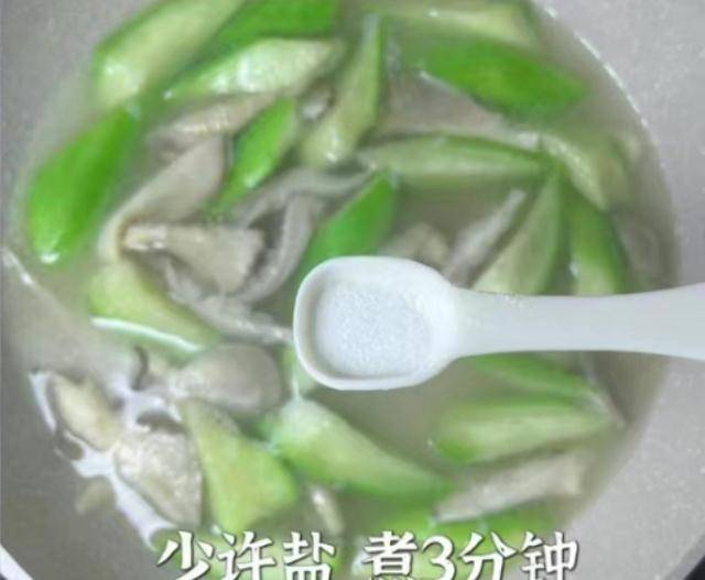 7:加上半勺味极鲜,加上一丢丢食盐调味,加上胡椒粉半勺,用锅铲翻动一会儿,撒上小葱花点缀,出锅,这款丝瓜牛肉菌菇汤就开吃了。