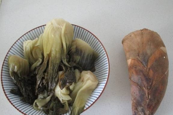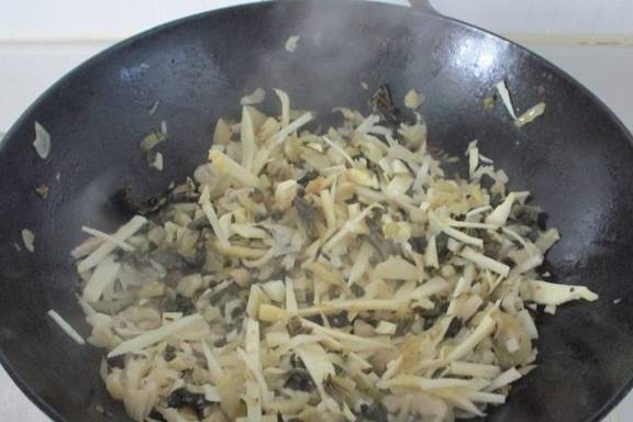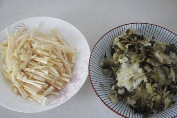 冬笋去壳后切成丝,咸白菜切碎后挤干水分