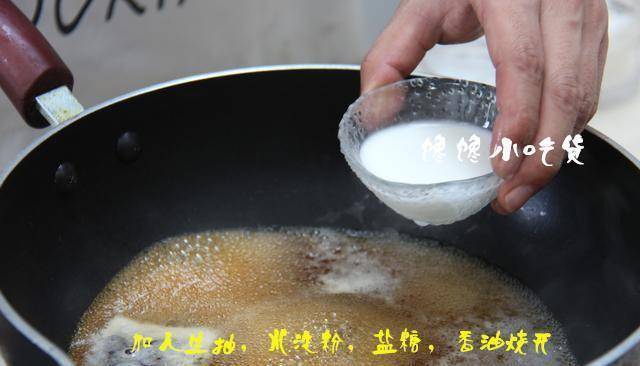 在蒸香菇的过程中,开始调料汁了,在锅中加入少量的水,然后加入生抽、水淀粉、盐、白糖和香油烧开,知道颜色变深,锅中冒大泡泡即可。