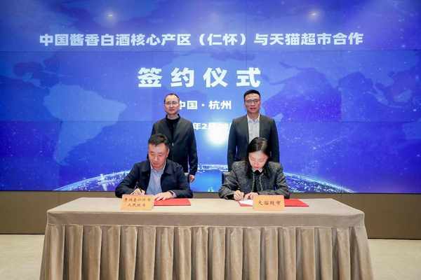 2月28日,贵州省仁怀市人民政府代表仁怀酱酒产业带与天猫超市在杭州签署战略合作,双方此次战略合作围绕中国酱酒馆项目展开,内容涵盖产业带品牌共建、消费者培育、中国酱酒馆产品营销和推广三大方面。仁怀酱酒集团、夜郎古酒业、金酱酒业、国威集团、黔酒股份、钓鱼台酒业、国台酒业、怀庄酒业等仁怀名酒企代表均到场见证。