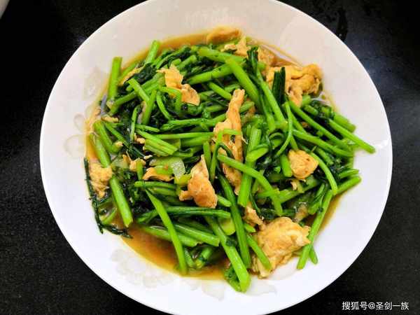 4、 茼蒿芽炒至断生,把鸡蛋倒入锅中,两种食材一起翻炒均匀即可。