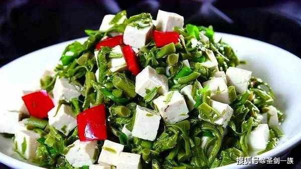 2、然后把烫熟的香椿切成碎丁,和豆腐块一起倒入盘子内