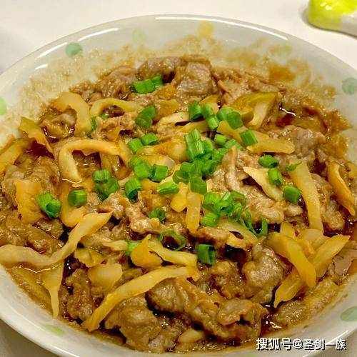 3、浸泡好的榨菜丝控干水分均匀的摆在盘子底部,将腌好的牛肉片平铺在榨菜丝上,然后放入蒸屉大火蒸制10分钟即可。