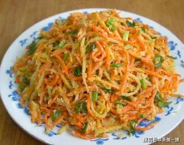 1、土豆和胡萝卜去皮切丝后放入清水中冲洗几遍,控水捞出。