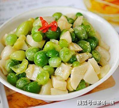 食材:春笋1个,蘑菇7个,豌豆100克,盐适量,竹盐果蔬粉适量