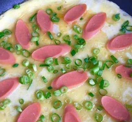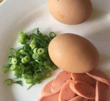最后摆上切好的火腿肠片,然后撒上葱花作为点缀和出味。煎熟,一顿美美的早餐就好啦。